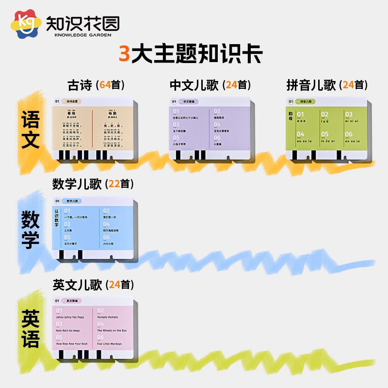 60首精选古诗,24首中文儿歌,22首数字儿歌,24首英文儿歌,11首拼音儿歌